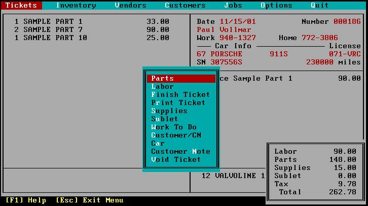 A second version added networking capability (Btrieve already supported network database access and control). My friend was able to have three computers at his shop, one for writing and closing tickets, one for managing the parts inventory, and one for accounting. Although I included the ability to configure the shop name in anticipation of perhaps trying to offer this commercially, it was a gray area for me since I was working for IBM at the time, and wasn't sure of the how they would view one of their employees selling software on the side.